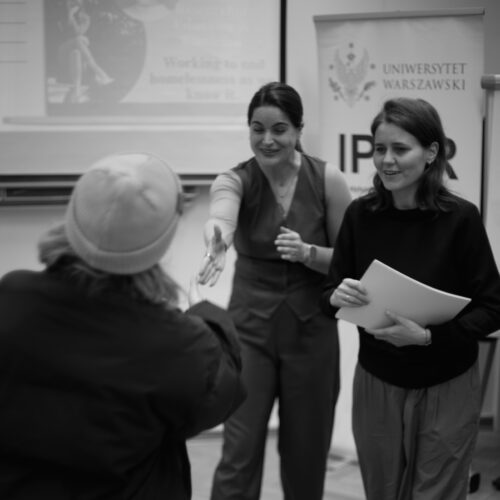W poniedziałek, 3 listopada 2025 roku, w Instytucie Profilaktyki Społecznej i Resocjalizacji Uniwersytetu Warszawskiego odbyły się inspirujące warsztaty prowadzone przez dr Caitlin M. Krenn nowojorską pracownicę socjalną, badaczkę i edukatorkę specjalizującą się w wsparciu osób będących w kryzysie bezdomności. Wydarzenie zgromadziło studentów, nauczycieli akademickich oraz praktyków pracy socjalnej zainteresowanych poznaniem nowoczesnych, międzynarodowych metod przeciwdziałania kryzysom mieszkaniowym.