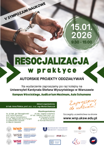 w V Jubileuszowym Sympozjum Naukowym „Resocjalizacja w praktyce. Autorskie projekty oddziaływań”, które odbędzie się 15 stycznia 2026 roku, w godzinach 9:30–15:00, na Uniwersytecie Kardynała Stefana Wyszyńskiego w Warszawie, Kampus Wóycickiego, Auditorium Maximum – Aula Schumana (bud. 21).