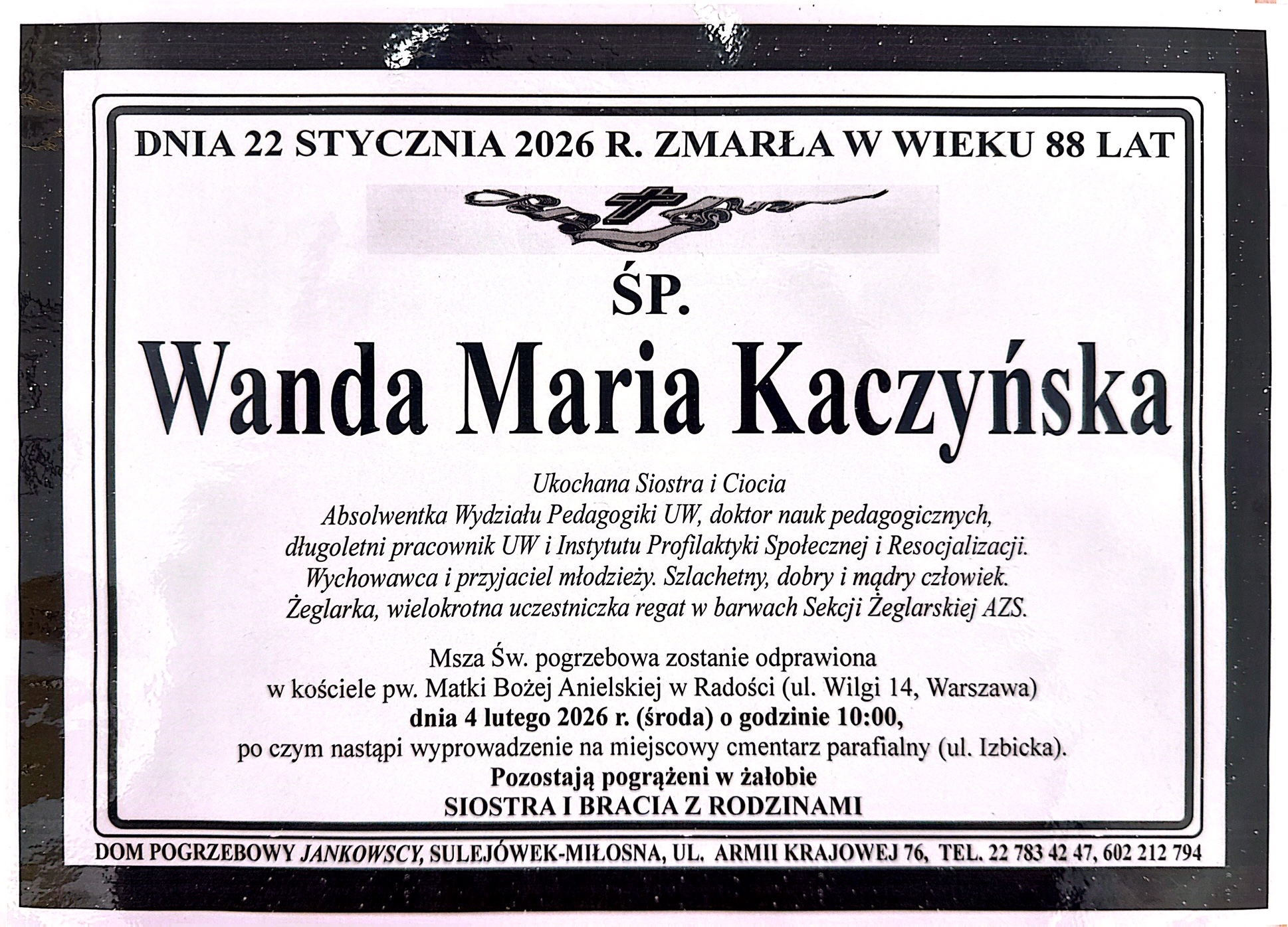 Z przykrością informujemy, że w dniu 22 stycznia 2026 roku, w wieku 88 lat zmarła dr Wanda Kaczyńska, emerytowana pracownik naszego Instytutu.
